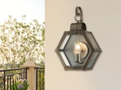 Der sechseckige Korpus der hängenden Wandlampe besteht aus Aluminium, welcher in Bronze lackiert wurde. Der Lampenschirm besteht aus strukturiertem Glas