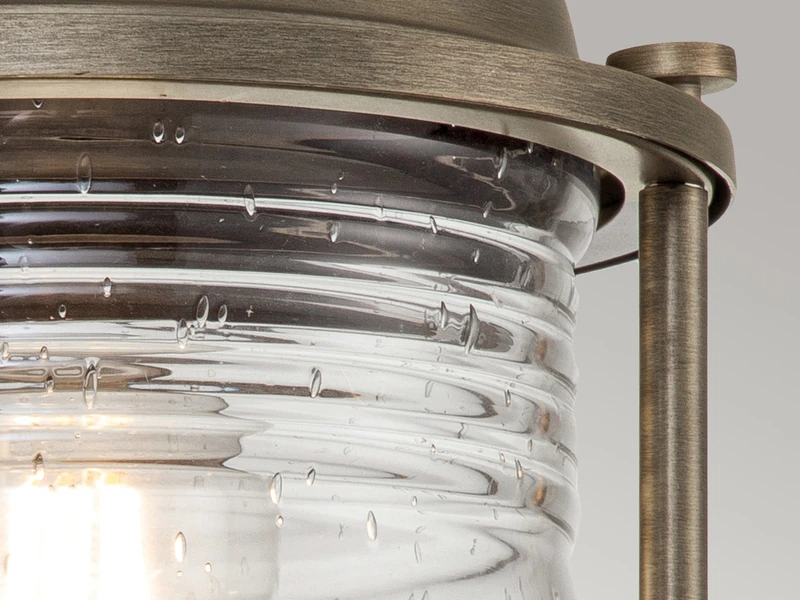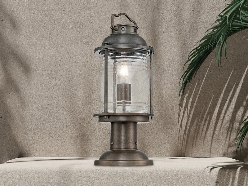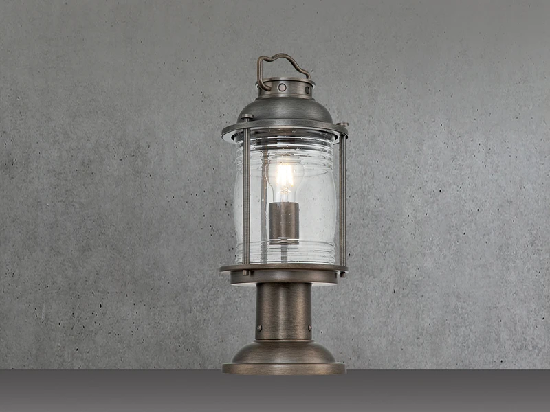 Gefertigt aus wetterfestem Stahl ist sie ein schöner Eyecatcher im Garten oder auf dem Grundstück und beleuchtet zuverlässig Gartenwege, Terrassen und Eingangsbereiche. Der Lampenschirm aus strukturiertem Glas und der Korpus in Bronze verleihen der robusten Außenleuchte den typischen Laternenlook im rustikalen Industriedesign.