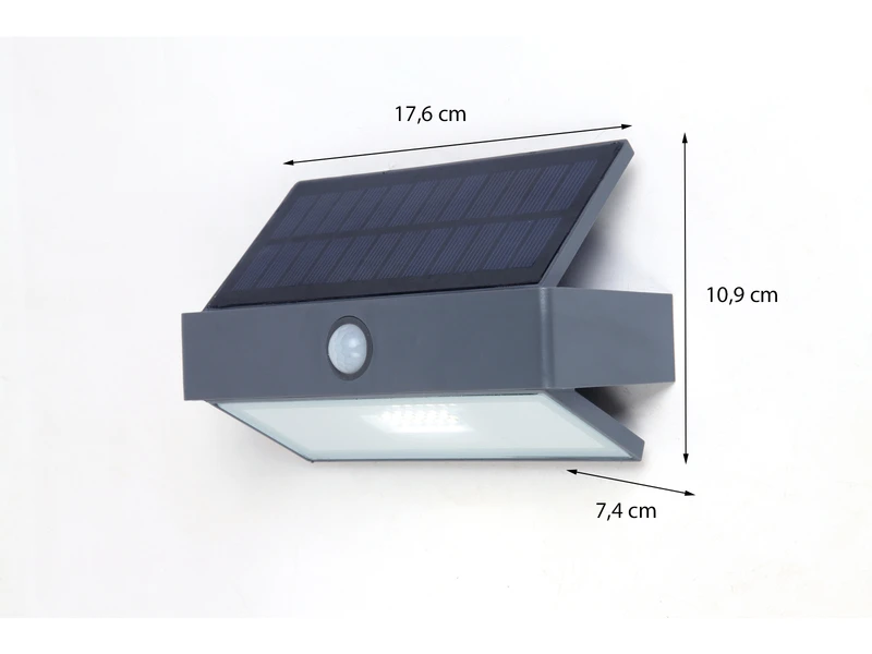 Bei einer Breite von 17,6cm und einer Höhe von 10,9cm hat sie eine Ausladung von nur 7,4cm. Durch die geschickte Lichtstreuung nach unten können Sie den gewünschten Außenbereich angenehm blendfrei ausleuchten und erhalten dabei einen schönen Lichteffekt. Das geneigte Solarpanel fängt effizient Sonnenstrahlen ein und durch den Bewegungsmelder wird nur dann Licht eingeschaltet, wenn es benötigt wird.