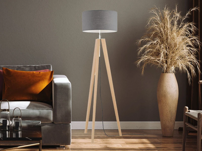 Diese Tripod Stehlampe vereint einen modernen Look mit dem gemütlichen Flair von Echtholz.