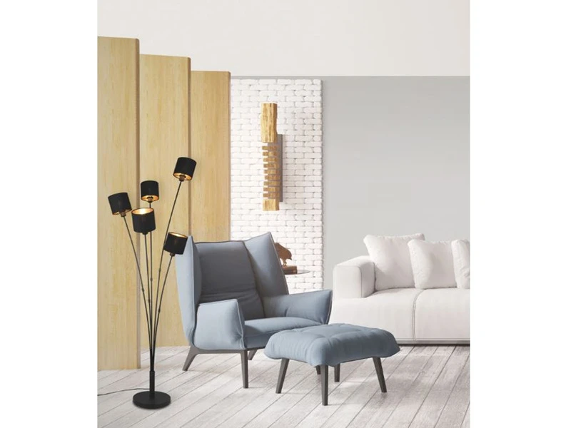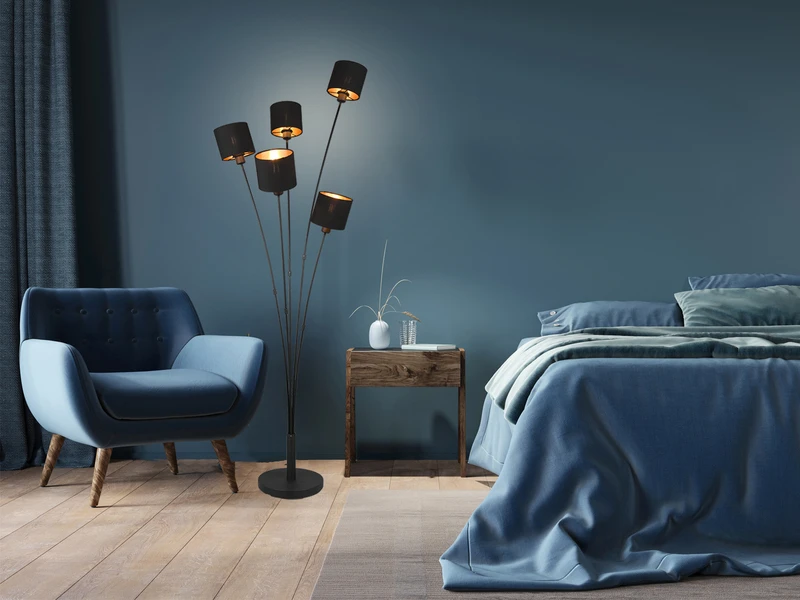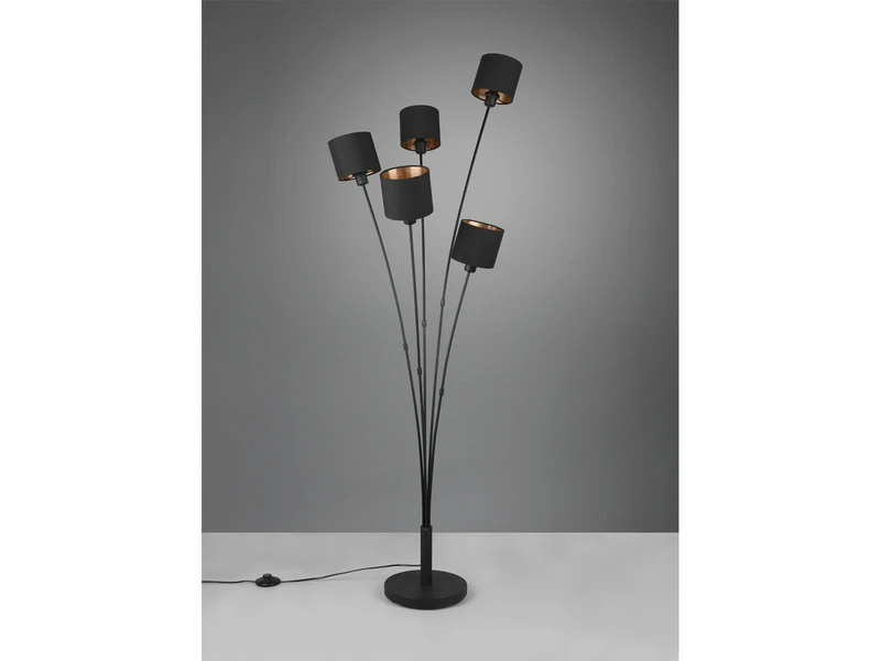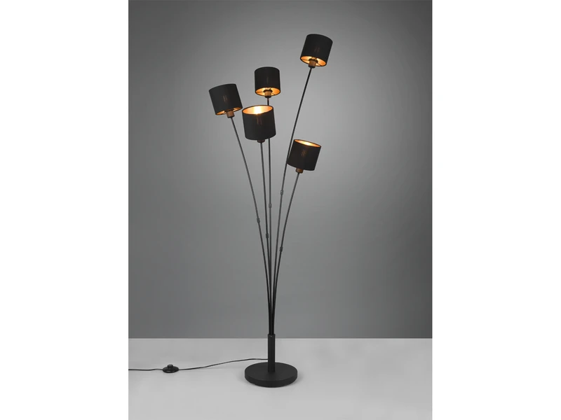 Die 5 flammige 163cm große Stehleuchte schafft Akzente und steht für ein wohnliches Licht, da Textilschirme den Behaglichkeitsfaktor erhöhen und ein gemütliches Ambiente zaubern. Zeitgleich kreieren die klaren Formen einen modernen und schlichten Stil, der sich vielseitig einsetzten und kombinieren lässt. In Schwarz matt / Gold, rundet die Stehleuchte moderne Einrichtungsstile optimal ab. Die Designer Leuchte ist aus Metall hergestellt, und wird bequem per Fußschalter ein-aus geschaltet.
