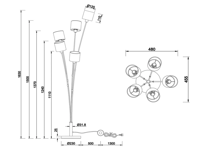 Die Stehleuchte ist mit fünf E14 Fassungen ausgestattet und wird inklusive fünf stufenweise dimmbaren LED Leuchtmitteln á 4,9 Watt, 470 Lumen & 3000 Kelvin in Warmweiß geliefert.