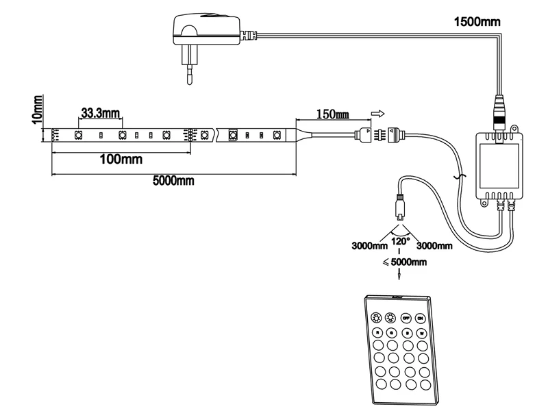 Die auf dem fünf Meter langen Steifen verbauten LED lassen sich mit Hilfe der beiliegenden Fernbedienung in allen Regenbogenfarben sowie in verschiedene, wechselnden Farbmodi durchschalten. Zusätzlich ist die Leuchte mit einem stufenlosen Dimmer ausgestattet.