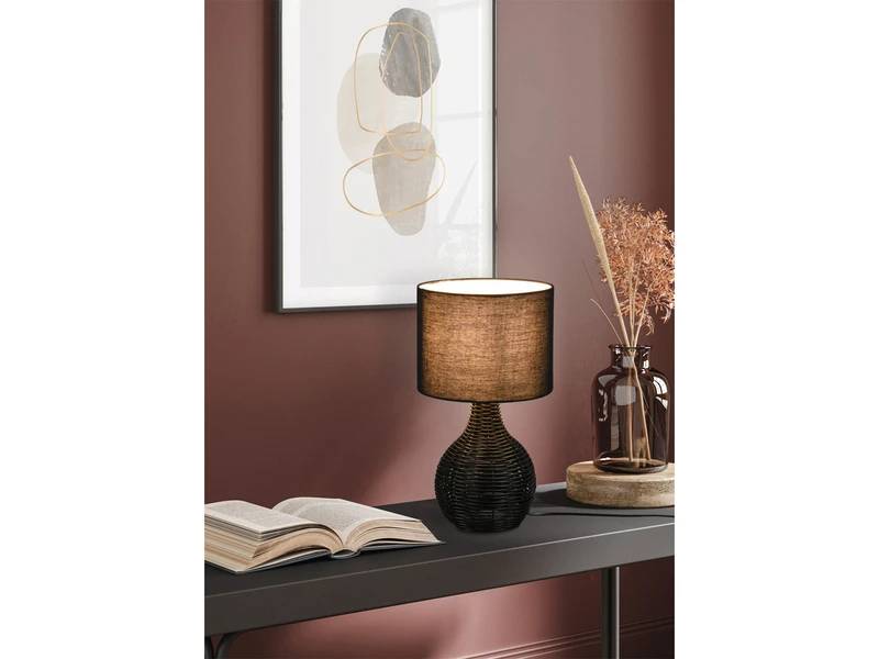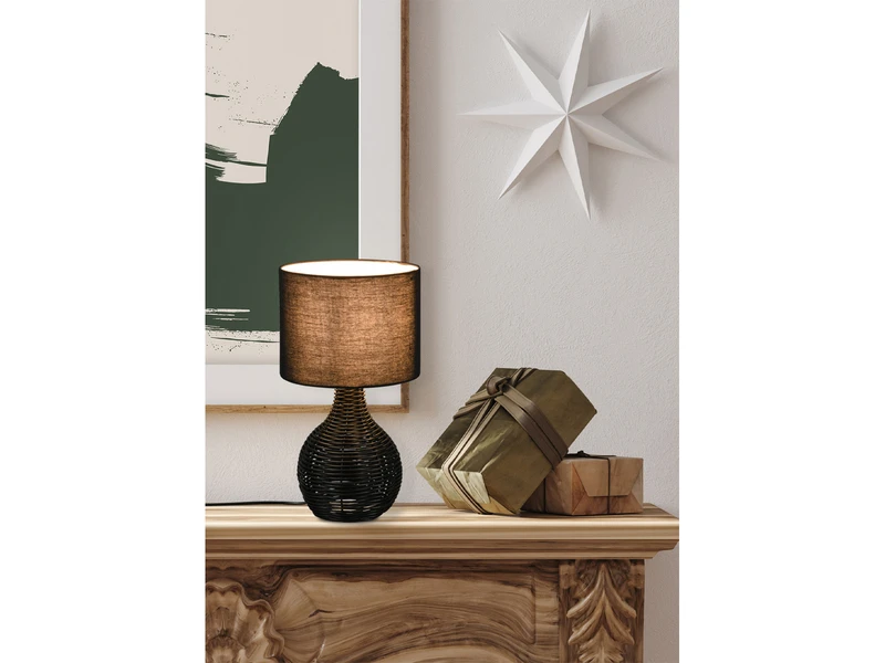 Im trendigen schwarzen Rattangeflecht setzt die Tischleuchte warme Akzente und bringt durch die Kombination aus natürlichen Materialien Gemütlichkeit in Ihr Zuhause.