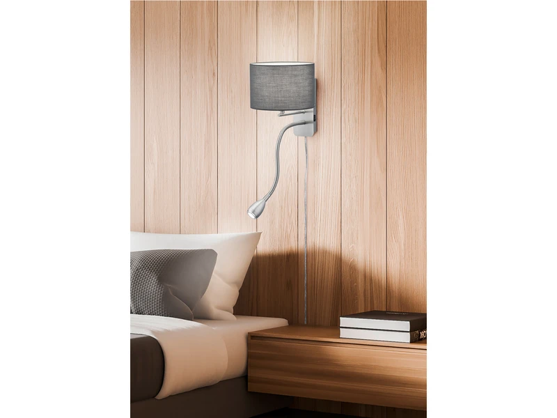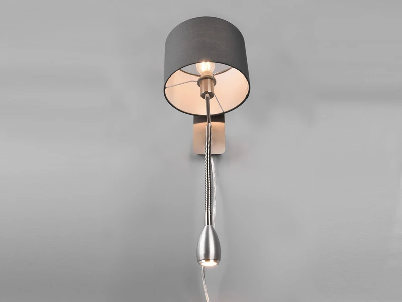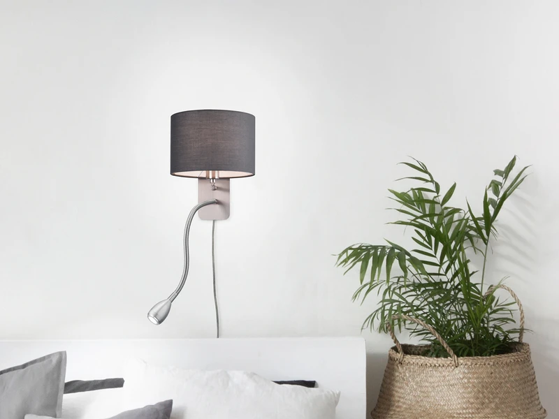 Mit ihrem edlen Design sorgt sie für ein gemütliches Flair in Ihrem Zuhause und verwöhnt Sie ganz nebenbei mit einem stimmungsvollen Licht. Das harmonische Design der ca. 23,5 cm hohen Wandleuchte wird durch den runden Lampenschirm aus grauem Stoff sowie dem Korpus in Silber matt gekonnt unterstrichen.