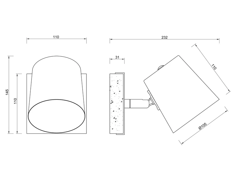 Die Montageplatte ist 11 x 11 cm groß, der Metallschirm hat einen Durchmesser von 10,5 cm, und mit einer Ausladung von 23,2 cm kann das schwenkbare Multitalent an der Decke oder Wand montiert werden.