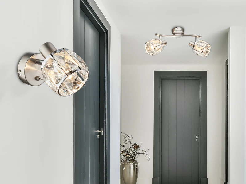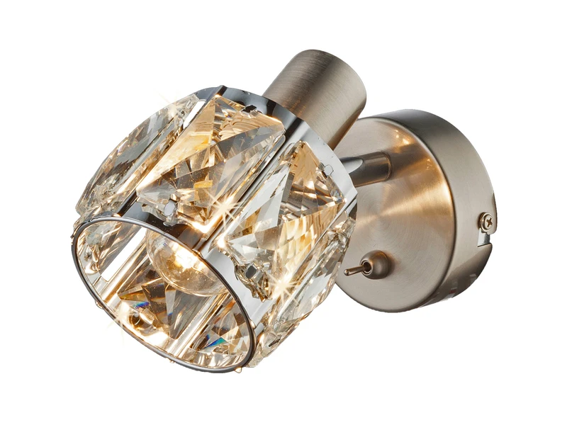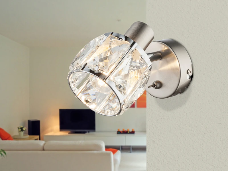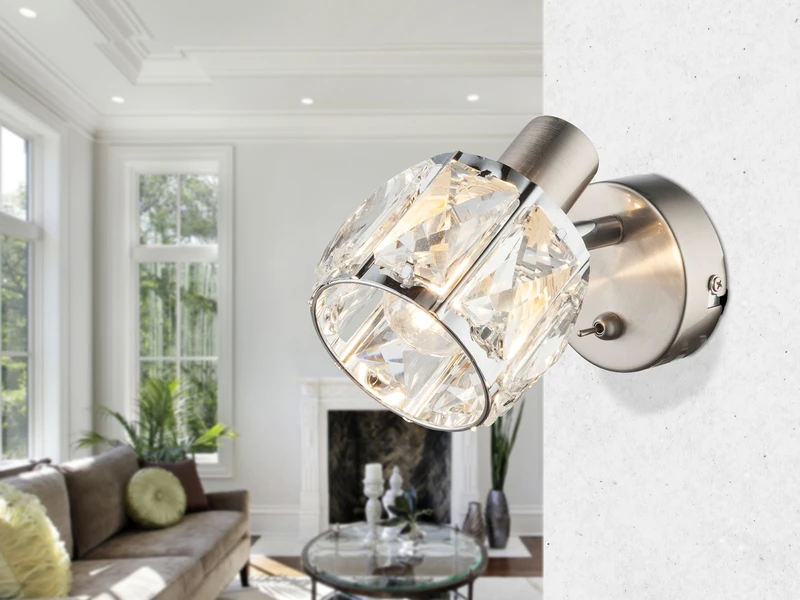 Der Wandstrahler verbindet Material und Design. Das mit einem Schalter ausgestattete silber matte Wandschild dieser Wandlampe trägt einen eleganten beweglichen Strahler aus edlen Glaskristallen in verchromten Metall eingefasst.