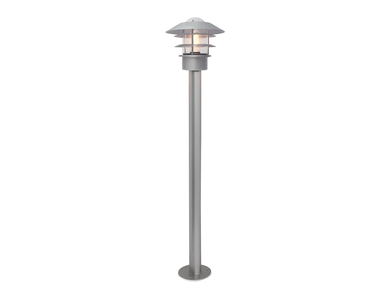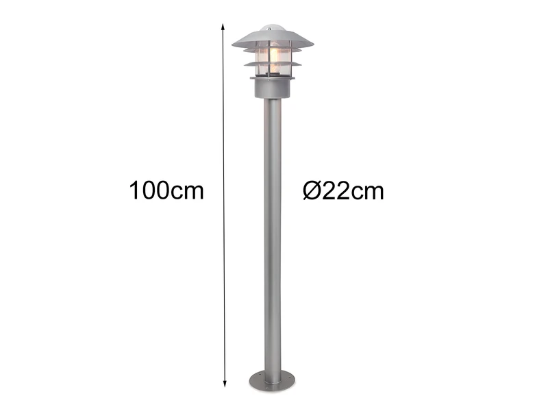 Gefertigt ist die stehende Außenlaterne aus Edelstahl 304 in Silber, welches zusätzlich pulverbeschichtet wurde, um der Leuchte zusätzliche Haltbarkeit zu verleihen. Somit ist sie robust genug um rauen Umgebungsbedingungen standzuhalten, und eignet sich daher hervorragend für den Einsatz in Küstengebieten. Der Lampenschirm besteht aus klarem Glas.