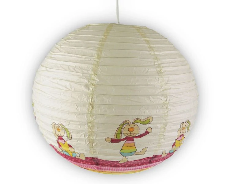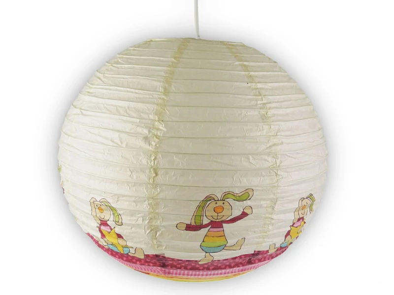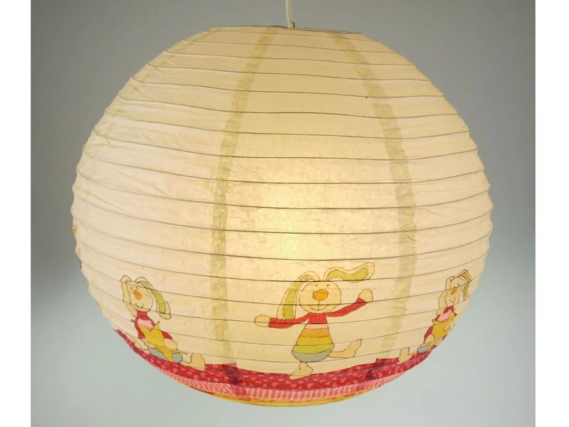 Die Kinder Hängelampe mit Papier Lampion ist vielseitig in jedem Kinderzimmer einsetzbar – mit ihrem kindgerechten und ansprechenden Häschen Design sorgt die Kinder Deckenleuchte für Begeisterung. Ganz gleich ob Sie auf der Suche nach Kinderlampen für Mädchen, Jungen oder Kinderzimmerlampen fürs Baby sind, mit der neutralen Farbgebung und dem fröhlichen Rabbit Motiv ist diese LED Kinderleuchte für viele Kinderzimmer geeignet. Auch als Deckenlampe im Babyzimmer macht dieses Kinderlicht eine angenehme Atmosphäre. Der Papierlampenschirm der Kinder Hängeleuchte hat ein Durchmesser von 40 cm.