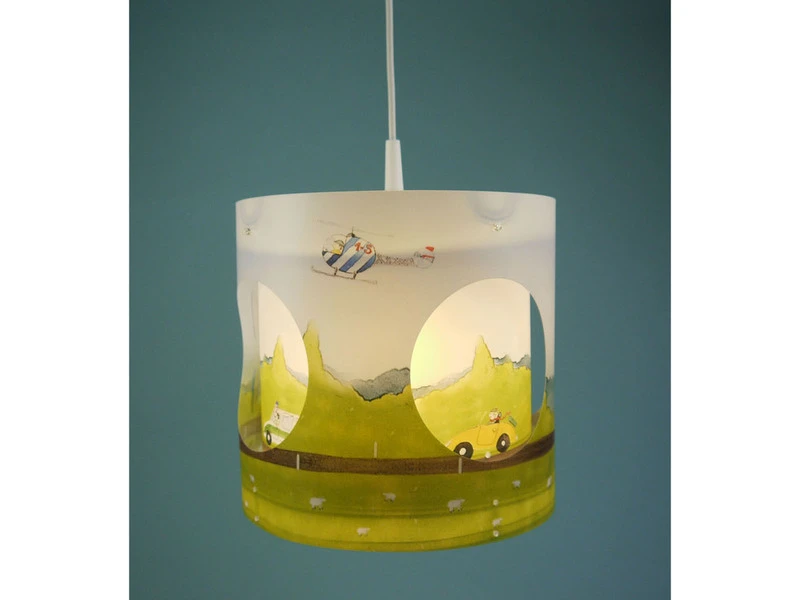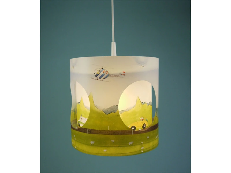 Das schöne Motiv Automobil mit Hubschrauber und der sich drehende innere Lampenschirm werden der Hingucker im Kinderzimmer.