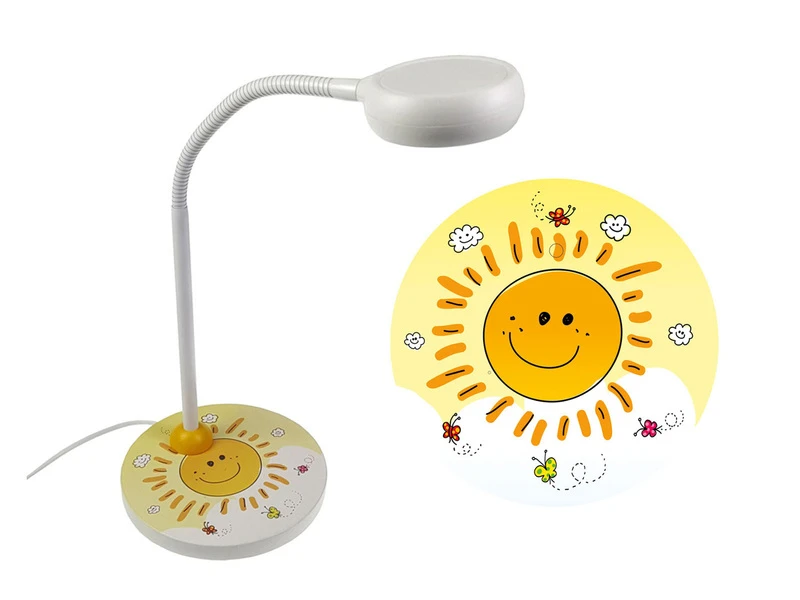 Diese praktische, flexible Leseleuchte mit den Abmessungen 200 x 200 x 430 mm /Ausladung 350 mm ist ein origineller Blickfang in jedem Kinderzimmer – aber auch im Wohnraum bzw. auf dem Schreibtisch aller Sonnenanbeter.
