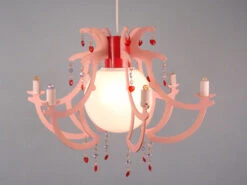 Der Korpus in rosa ist aus Holz, die Kugel bruchsicher (kein Glas) sorgt für die vorgeschriebene Sicherheit im Kinderzimmer. Die aufgesetzten „Kerzen“ und die kleinen, bunten Kristallanhänger verleihen der Hängeleuchte eine verspielte Romantik.