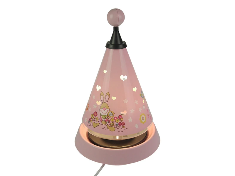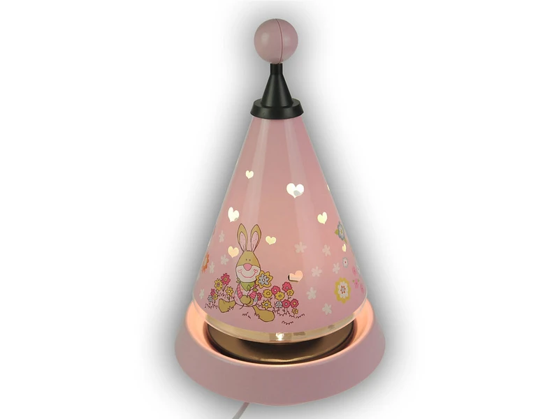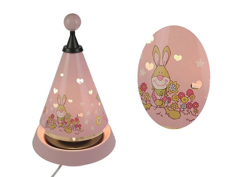Der Schirm der Nachttischlampe ist mit einem fröhlichen Hasen bedruckt, und lädt Ihre Kinder immer wieder zum Betrachten und Hinsehen ein.