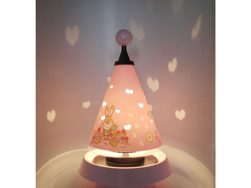 Am Abend sorgt die Tischlampe für eine entspannte Einschlafatmosphäre im Kinderzimmer. Beim Einschalten der Leuchte dreht sich der Kegel und projiziert unendlich viele Herzen in den Raum, die das ganze Zimmer in eine zauberhafte, sich langsam bewegende Traumlandschaft verwandeln.