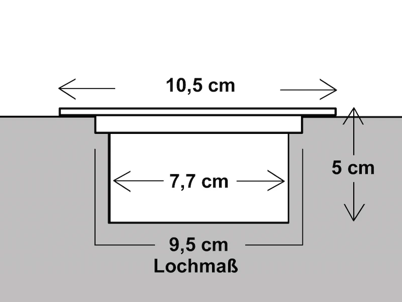 Der eckige Bodenspot hat eine Größe von: Oben 10,5cm x 10,5cm, Höhe 4,6cm, als Einbaumaß benötigen Sie einen Lochmaß von 9,5cm für den flachen Strahler.