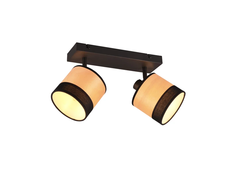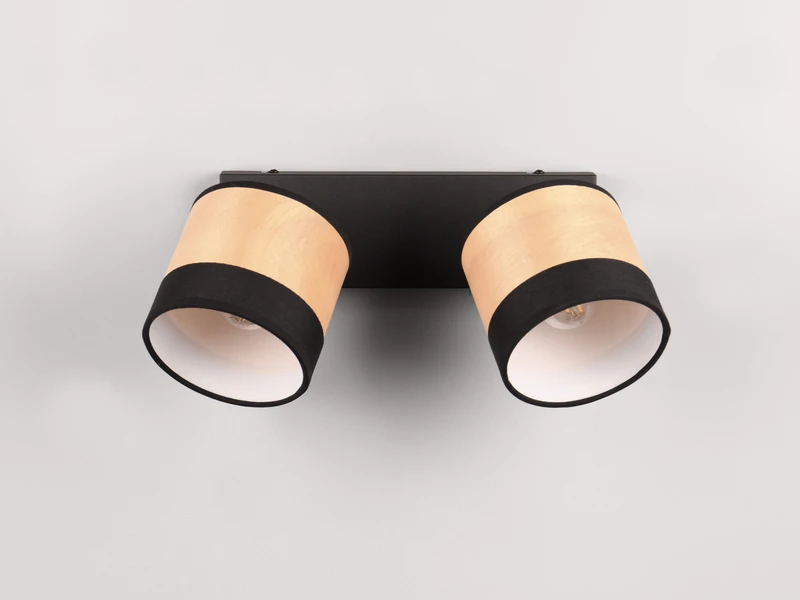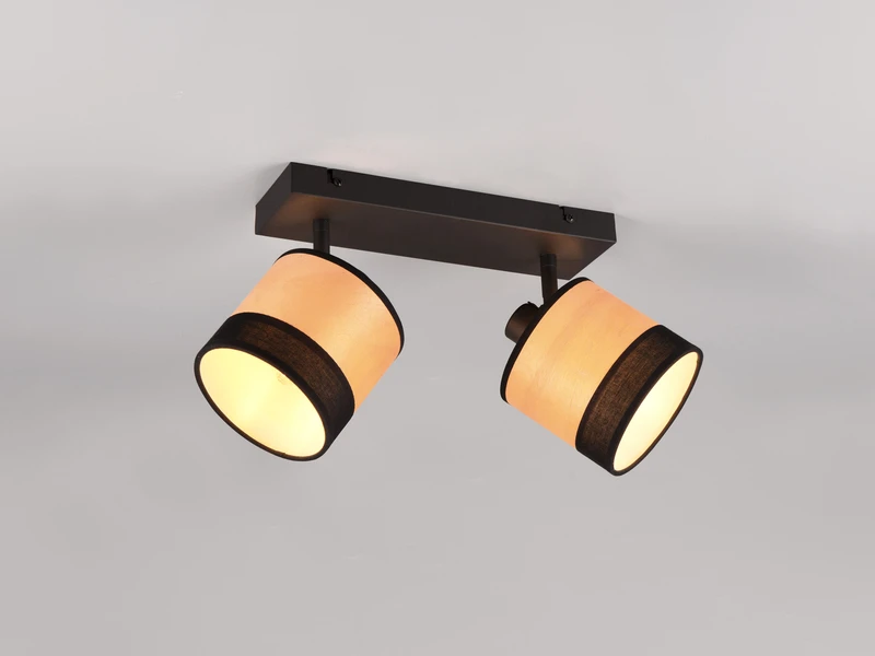 Der schwarze Metallkorpus der 36cm breiten Deckenleuchte ist mit zwei dreh-und schwenkbaren Lampenschirmen in Holzoptik ausgestattet was eine gezielte Lichtausrichtung ermöglicht.