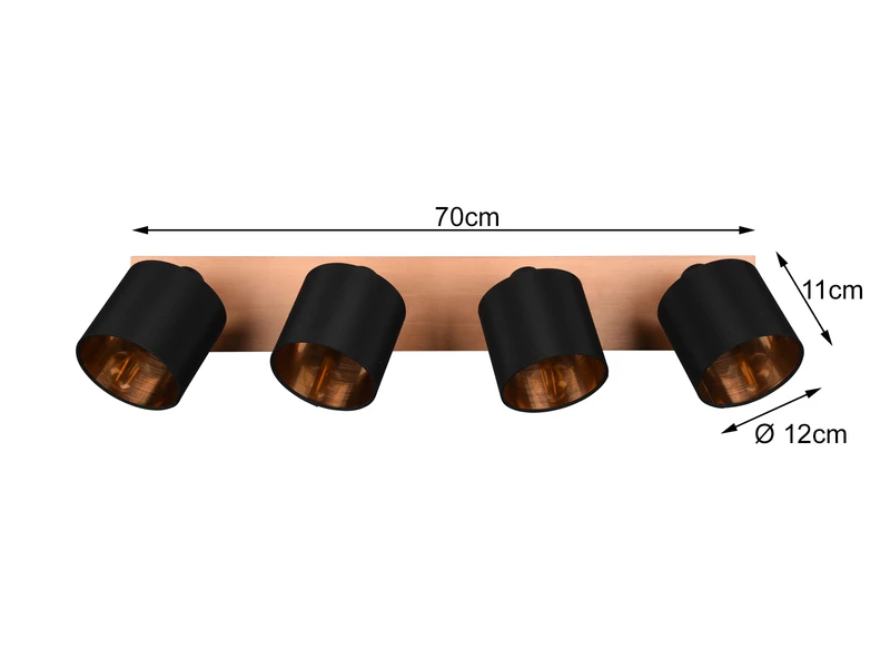 Dieser 4 flammige Deckenstrahler aus dem Hause Reality Leuchten präsentiert sich in einem attraktiven Designerlook. Der Leuchtenkopf lässt sich neigen und drehen, um die gewünschten Bereiche zu beleuchten. Dank des schlichten Designs aus Metall in schwarz mit 4 Stofflampenschirmen in schwarz gold ist die Innenlampe schon im Hellen ein wahrer Hingucker, und lässt sich in verschiedene Einrichtungsstile integrieren.