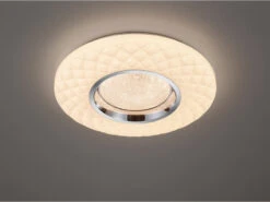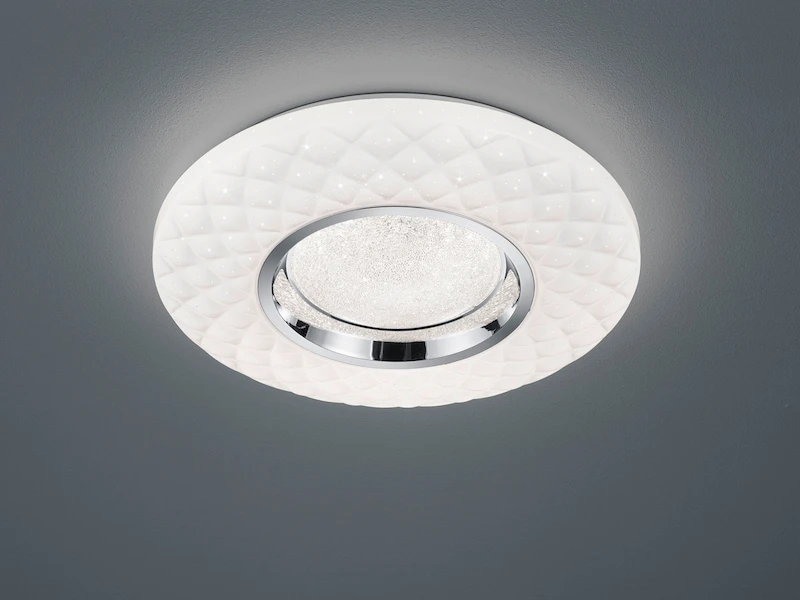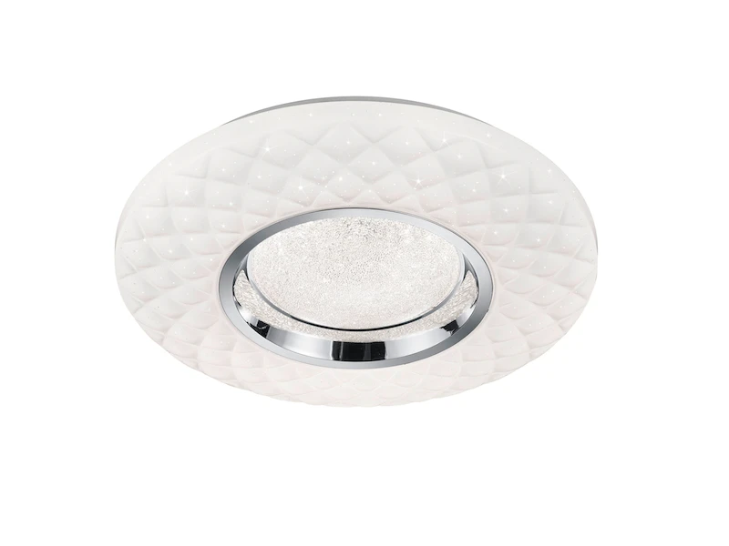 Die Einsatzmöglichkeiten dieser Deckenleuchte sind dabei ganz flexibel. Das Cover der Leuchte wirkt wie ein kleiner Sternenhimmel, der Ihren Wohnräumen das gewisse Etwas verleiht. Ebenso verfügt die Leuchte über eine Nachtlicht Funktion. Die angenehme Farbgebung in Chrom/Weiß unterstreicht das elegante Design der Leuchte, die sich vorzugsweise in klassischen Einrichtungsstilen wiederfindet oder bei modernen Wohnkonzepten für einen spannenden Stilbruch sorgt.