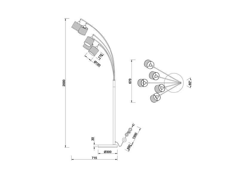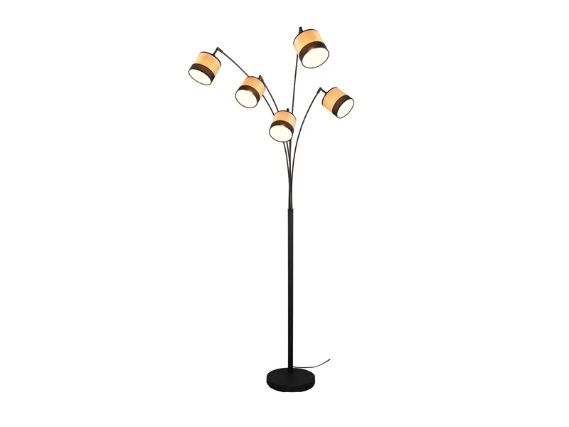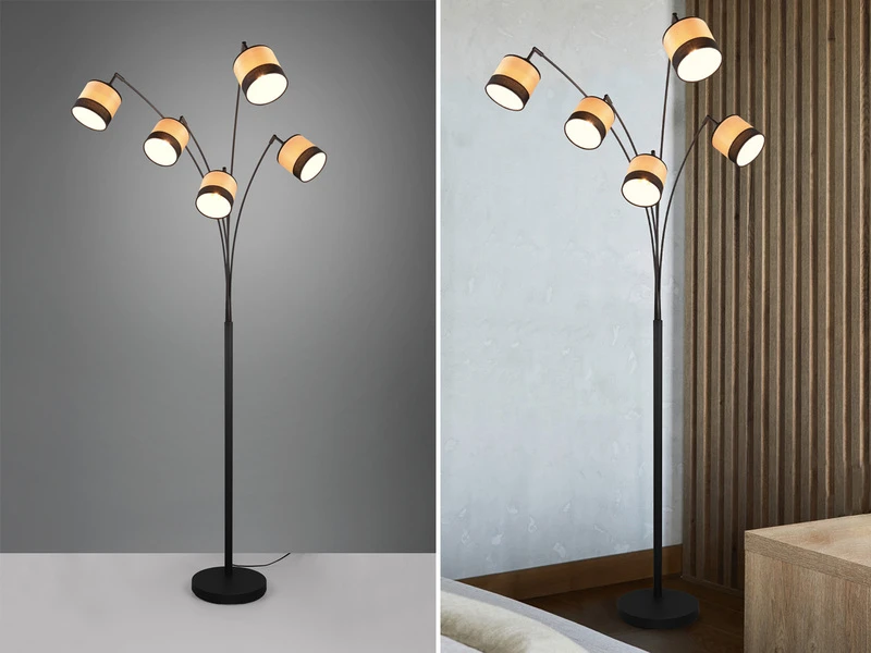 Ausgestattet mit 5 E14 Fassungen, die für Leuchtmittel bis max. 10 Watt geeignet sind, ist die gebogene Stehlampe im modernen Design eine tolle Zusatzbeleuchtung im Wohnzimmer oder Schlafzimmer.