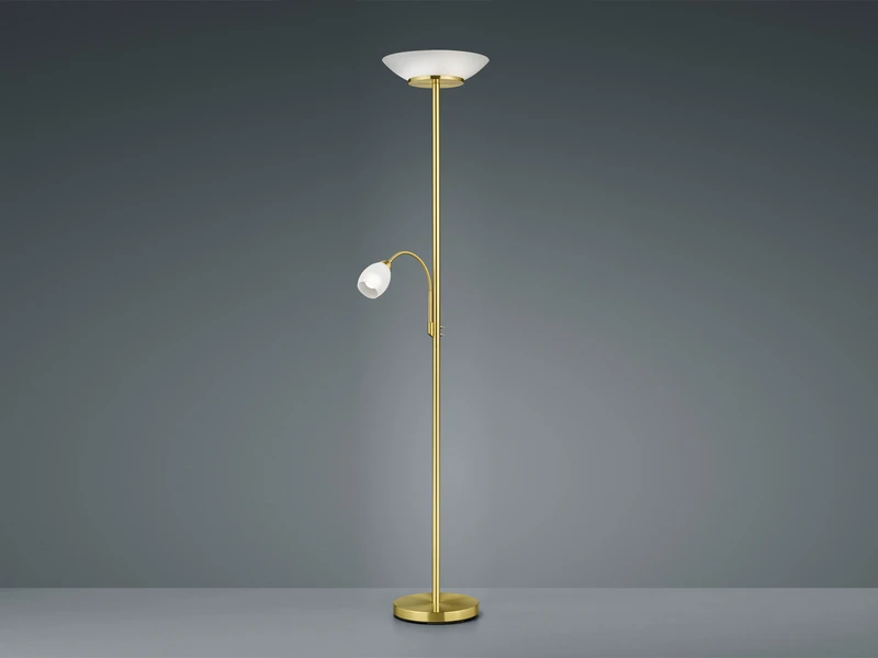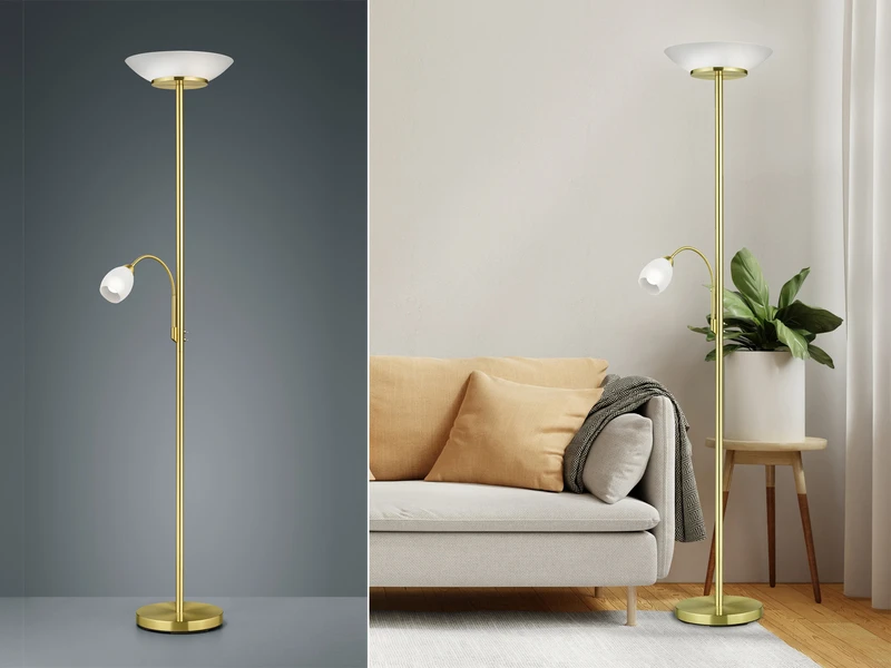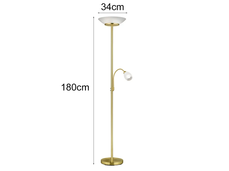 Die 180 cm hohe Stehleuchte ist aus Metall in der Farbe Messing matt gefertigt, die beiden Lampenschirme bestehen aus weißem Glas. Die Leselampe ist flexibel einstellbar und passt sich Ihren Wünschen optimal an. Der nach oben gerichtete Fluter verstrahlt ein gemütliches Licht nach oben. Mit dem in Griffhöhe am Leuchtenkorpus angebrachten Ein-/Ausschalter lässt sich die Standlampe bequem bedienen, wobei Leselicht und Deckenfluter getrennt einschaltbar sind.