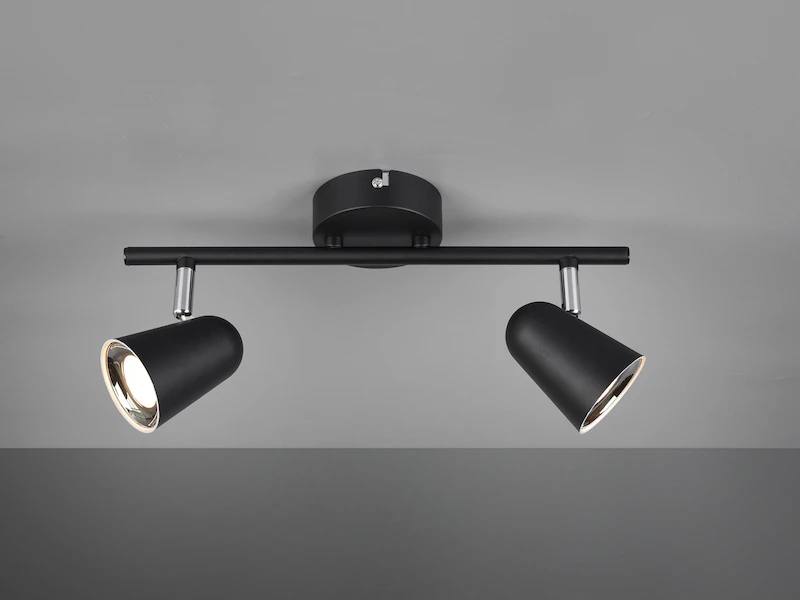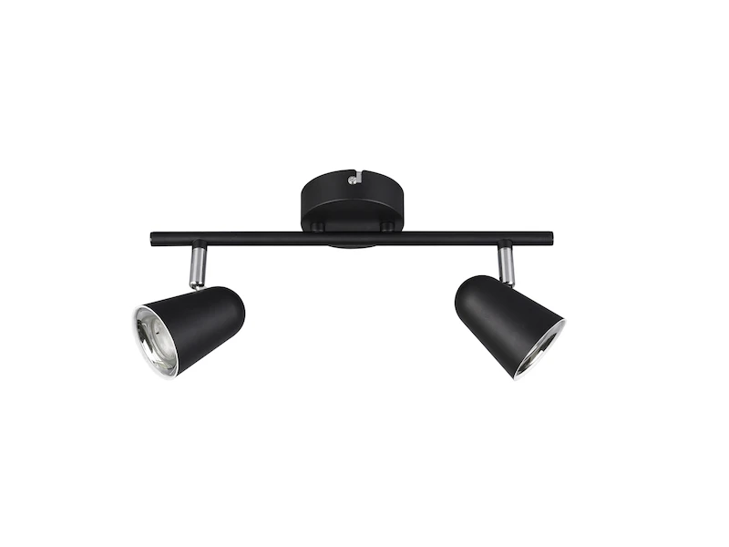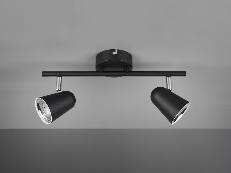 Dabei hat die zweiflammige Spotleuchte eine Breite von 34cm und 17cm Höhe, der Sockel hat 9cm Durchmesser. Die schwarz matte Farbgebung lässt sich mit verschiedenen Farbkonzepten kombinieren und macht somit ein Integrieren in Ihr Zuhause wunderbar einfach.