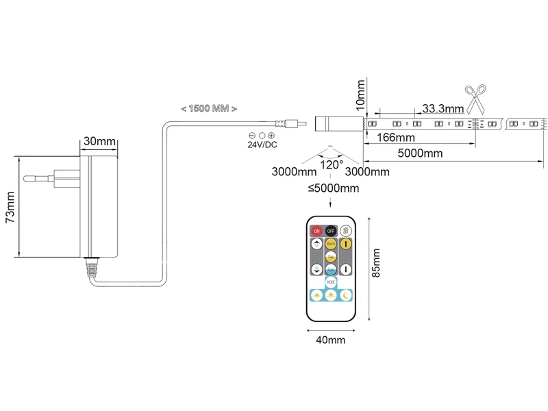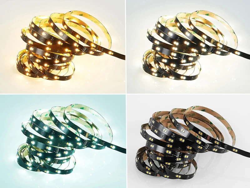 Die auf dem fünf Meter langen Streifen verbauten LED lassen sich mit Hilfe der beigelieferten Fernbedienung in der Helligkeit stufenlos dimmen und in drei Farbtemperaturen (von warmweiß bis tageslichtweiß) schalten. Zusätzlich verfügt der Strip über eine Memory Funktion, womit die zuletzt gewählte Licht-Einstellung gespeichert wird, und beim erneuten Einschalten der Leuchte wieder erstrahlt.