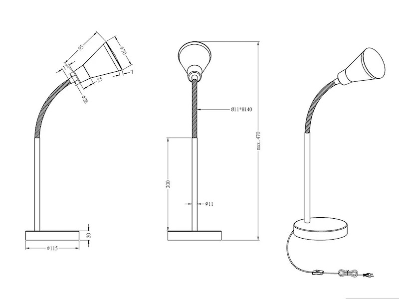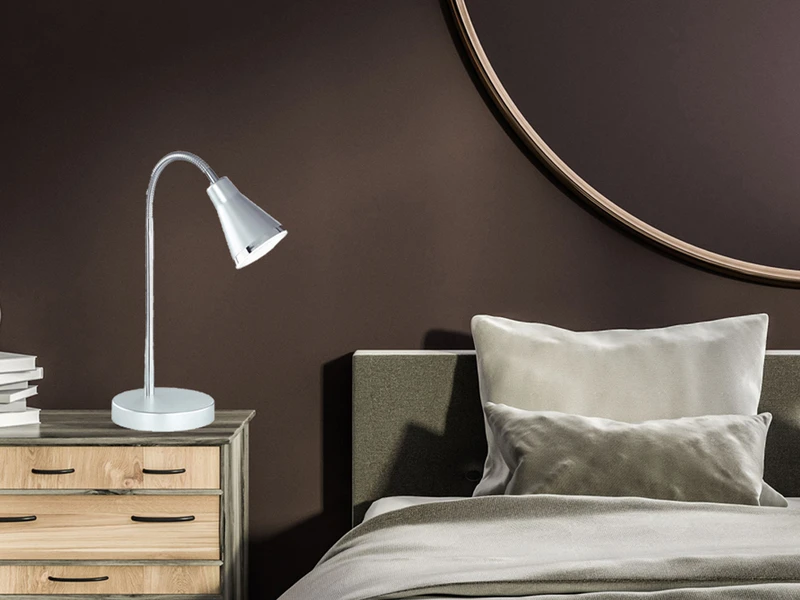So leistet sie vor allem als schicke Schreibtischleuchte gute Dienste, indem Sie ein effektives Arbeiten gewährleistet. Durch den Flexarm ist die Tischlampe individuell biegsam, der Leuchtenkopf in Spotform lässt sich nach persönlichem Belieben einstellen. Der integrierte Schnurschalter unterstützt dabei die komfortable Bedienung der Leuchte.