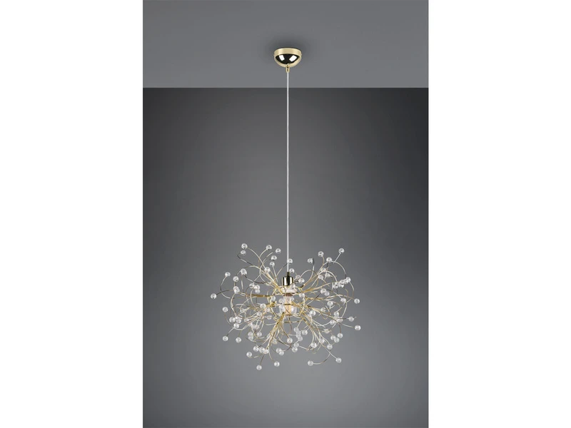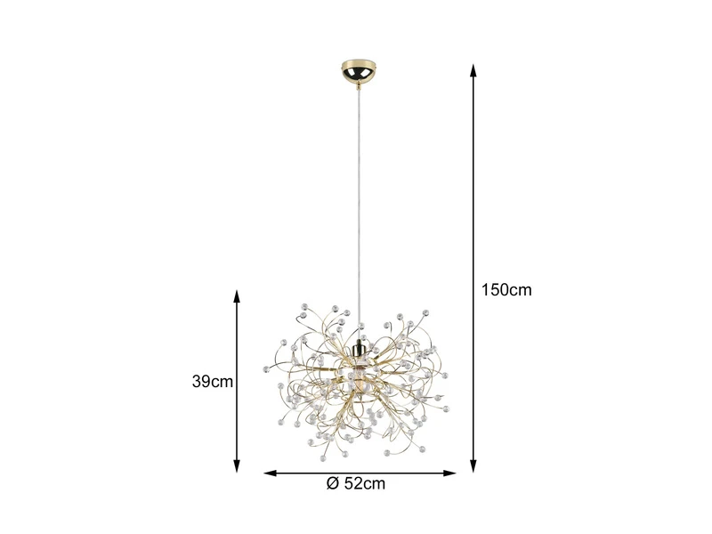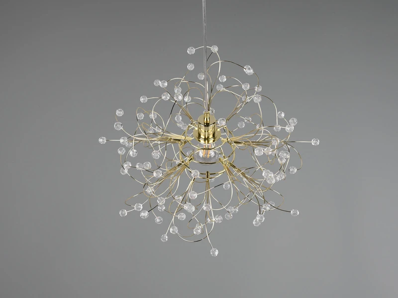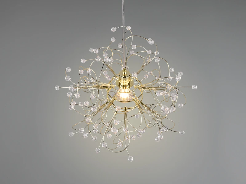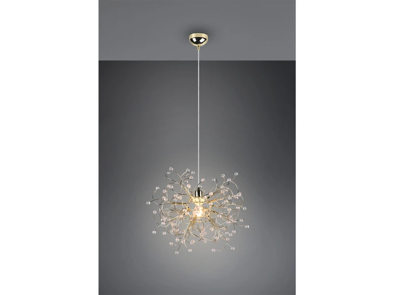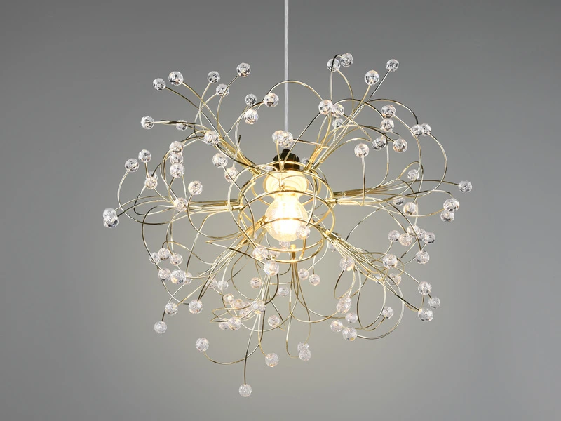 Die Pendelleuchte besticht durch ihre filigrane Form sowie durch die wunderschön wie Edelsteine funkelnden Applikationen, die für ein gemütliches Licht in Ihrem Wohnbereich sorgen. Ganz gleich, ob im Esszimmer oder Wohnzimmer – diese stylische Leuchte ist ein toller Hingucker. Durch das Metall in Messing poliert und die funkelnden Acryl-Applikationen erhält die Leuchte einen Hauch von Eleganz.