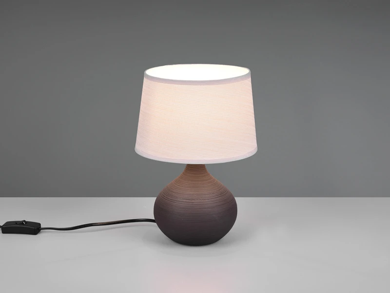 Die Tischlampe besticht durch ihren interessanten Mix aus modernen und klassischen Elementen und ist dadurch ein zeitloses Leuchtobjekt, welches neugierige Blicke auf sich zieht. Ein brauner Keramikfuß in Vasenform sorgt für die nötige Standhaftigkeit und die moderne Note. Der runde Lampenschirm aus Stoff in Creme setzt den Kontrast zu dem Keramik Körper mit dezenter Struktur.