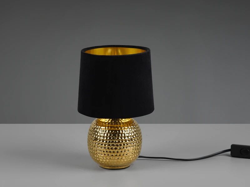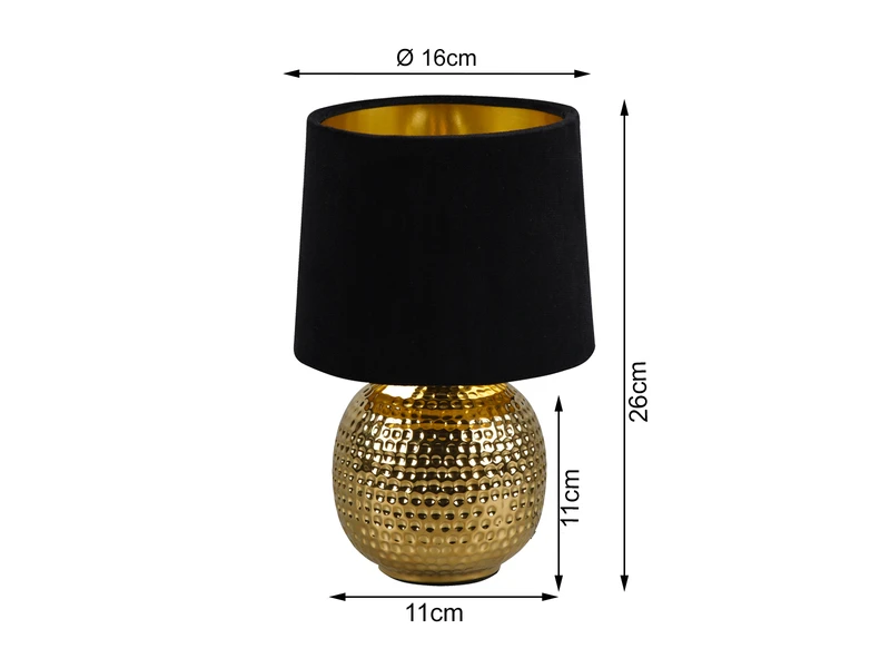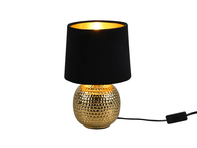 Die 26cm hohe Leuchte ist mit einem Schnurschalter ausgestattet, wodurch sie leicht ein- und ausschaltbar ist. Die Kombination, aus Keramik Fuß in Gold und dem Stoffschirm in Schwarz, sorgt für ein modernes Erscheinungsbild.