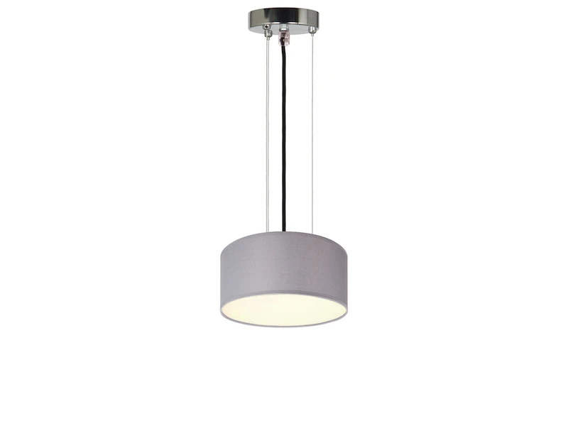 Der graue Stoffschirm verleiht der Hängeleuchte ihren ganz eigenen, stilvollen Charakter. Mit einem Schirmdurchmesser von 20 cm sowie einer kürzbaren silbernen Abhängung von 105 cm kommt das schöne Design des Pendels angenehm zur Geltung. Im Zusammenspiel mit der unteren, weißen Kunststoffabdeckung sorgt die Leuchte für ein blendfreies Licht Ambiente.