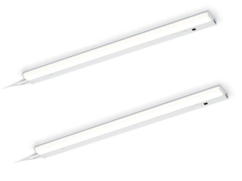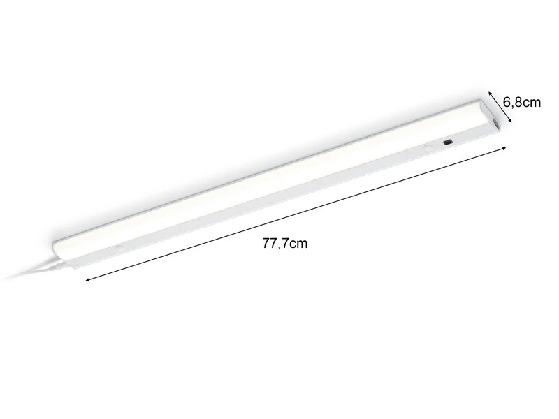 Gefertigt sind die Unterbauleuchten aus weißem Aluminium. Mit einer Länge von jeweils 77,7cm, einer Breite von 6,8cm und einer Höhe von 1,8cm sind sie sehr flach und für eine gute Ausleuchtung Ihres Arbeitsbereichs in der Küche perfekt geeignet.