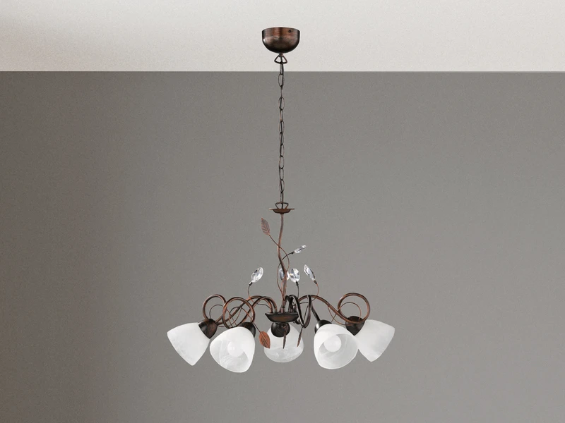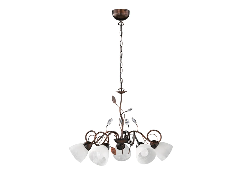 Mit ihrem typisch mediterranem Charme verleiht die rostfarbige Pendellampe im Antik-Look jedem Raum das gewisse etwas. Diese hochwertige Leuchte beeindruckt mit ihrer aufwändig gestalteten Deckenkrone mit Blätter-Design aus Metall und den schlichten alabasterfarbigen Glasschirmen.