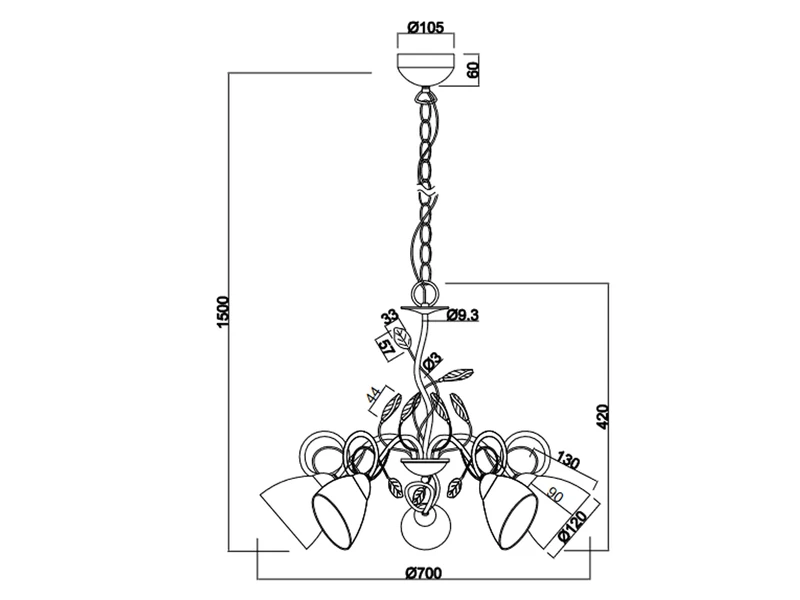 Die Hängeleuchte ist mit fünf E14 Fassungen ausgestattet und ist für Leuchtmittel mit einer Leistung von jeweils 40 Watt geeignet. Diese sind nicht im Lieferumfang mit enthalten. Bei Einbau eines geeigneten Leuchtmittels und eines Wanddimmers können Sie die Hängelampe über Ihre Hausinstallation dimmen und so zusätzlich für eine ganz individuelle Beleuchtung sorgen.