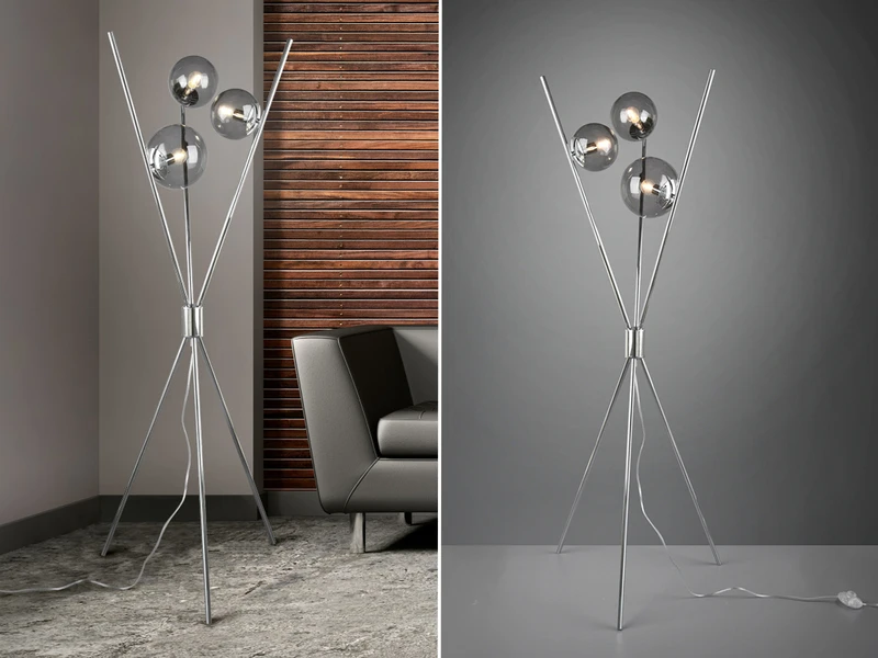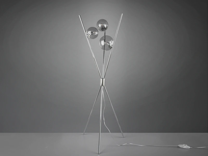 Der chromfarbige Tripod Corpus aus Metallstangen und die drei rauchfarbigen Glasschirme runden das auffällige Design dieser Innenleuchte ab.