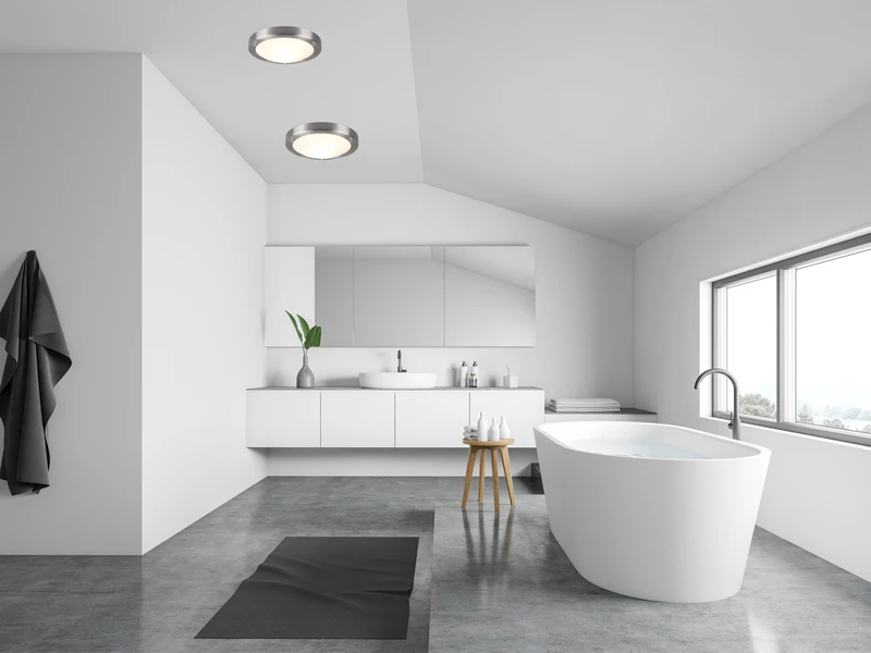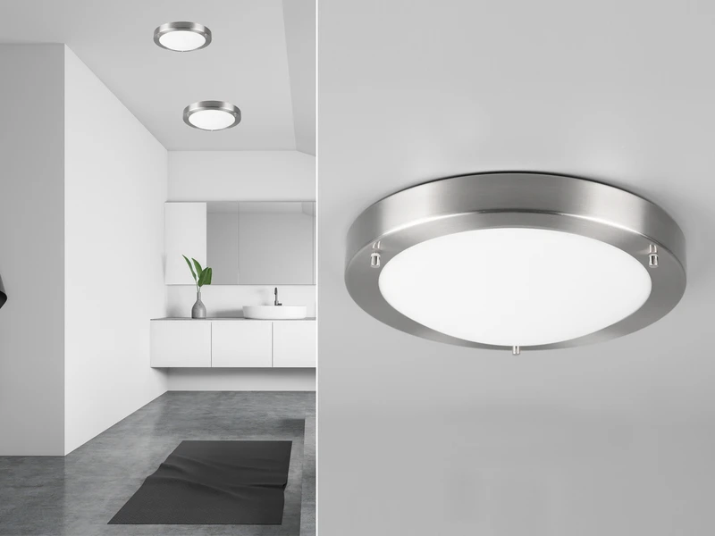 Dank Schutzart IP44 ist die Lampe gegen Spritzwasser geschützt und damit perfekt für alle Feuchträume, wie Badezimmer und Gäste WC geeignet. Die Kombination aus Metall in Silber Nickel matt und Opal weiß mattem Glas passt in jeden Wohnbereich. Dabei hat die Lampe einen Durchmesser von 31,5 cm sowie eine Höhe von nur 8 cm.