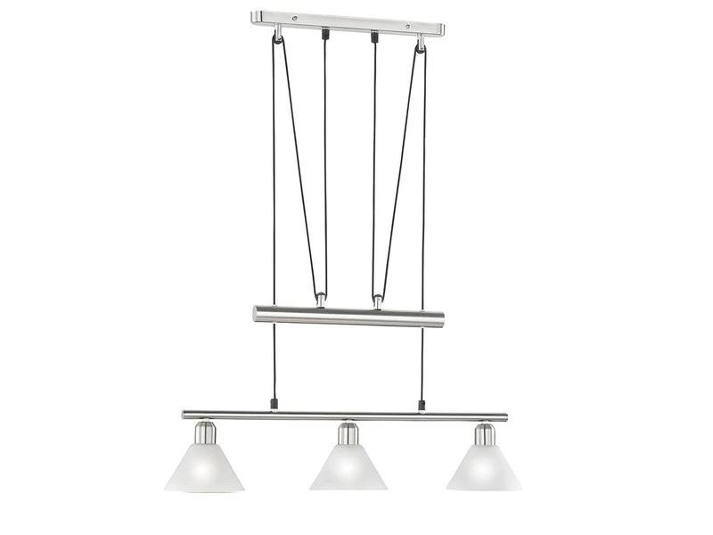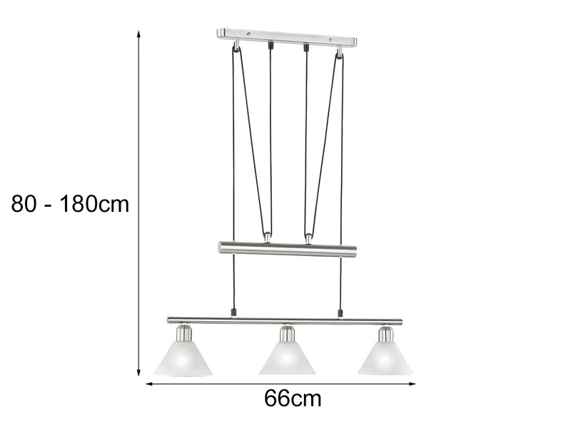 Die dekorativen Lampenschirme sind aus weißem Opalglas gefertigt und haben einen Durchmesser von jeweils 14 cm. Sie verleihen der Hängelampe ihren unverkennbaren Charakter. Im Zusammenspiel mit dem 66 cm langen, nickelfarbenen Metallkorpus kommen sie besonders gut zur Geltung und verwöhnen Ihren Wohnraum beim Einschalten des Pendels mit einer angenehmen, warmen Beleuchtung. Dank der stufenlosen Höhenverstellbarkeit im Bereich von 80 bis 180 cm passt sich die Hängelampe dabei Ihren individuellen Gegebenheiten perfekt an.
