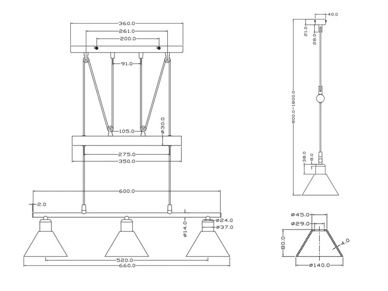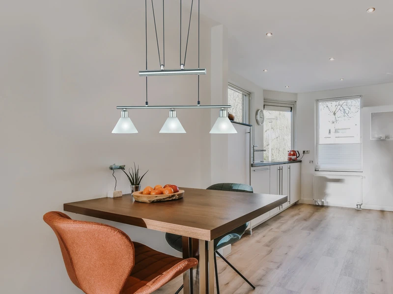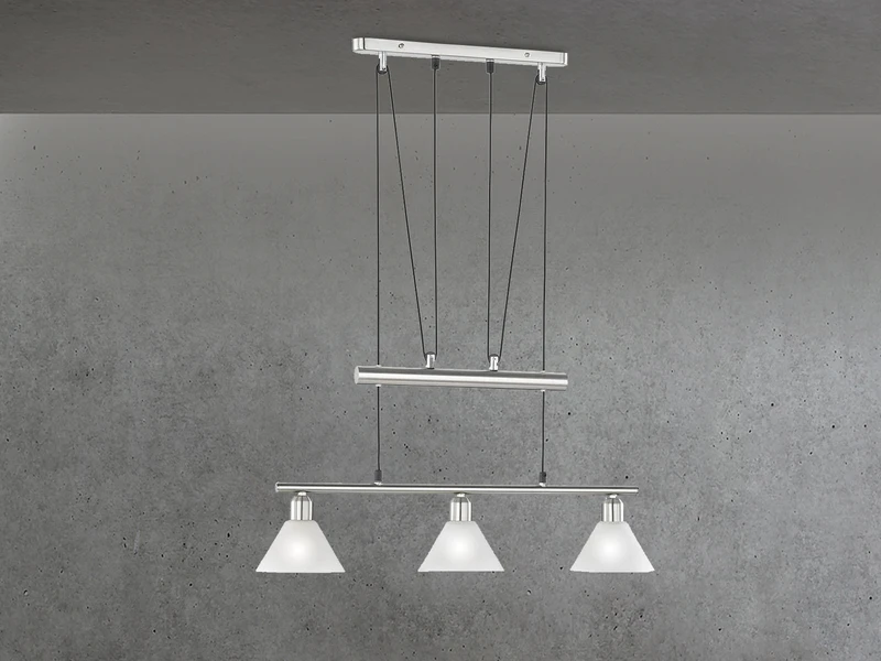 Die mehrflammige Hängeleuchte ist mit drei E14 Fassungen ausgestattet und für Leuchtmittel bis max. je 40 Watt geeignet. Bei Verwendung von dimmbaren Leuchtmitteln sowie zusätzlichem Einbau eines geeigneten Wanddimmers lässt sich das Balkenpendel über Ihre Hausinstallation dimmen, so dass Sie für eine ganz individuelle Beleuchtung sorgen können.