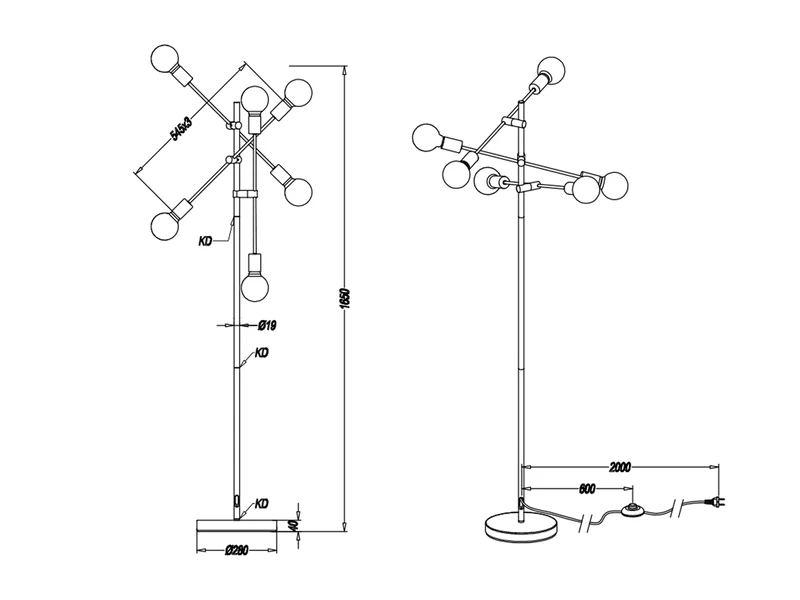 Die 6-flammige Leuchte hat eine hat eine Höhe von 165cm und im oberen Teil einen Durchmesser von ca. 54, 5cm. Die sechs E27-Fassungen können mit Leuchtmitteln bestückt werden, die eine Leistung von 28W nicht überschreiten. Da man einen direkten Einblick auf die Leuchtmittel hat und diese nicht von einem Leuchtenschirm verdeckt werden, empfehlen wir ein Filament Leuchtmittel zu verwenden. Dies lässt es harmonisch erscheinen, vervollständigt das Gesamtbild und lässt sie schnell zum neuen Eyecatcher in Ihrem Zuhause werden.