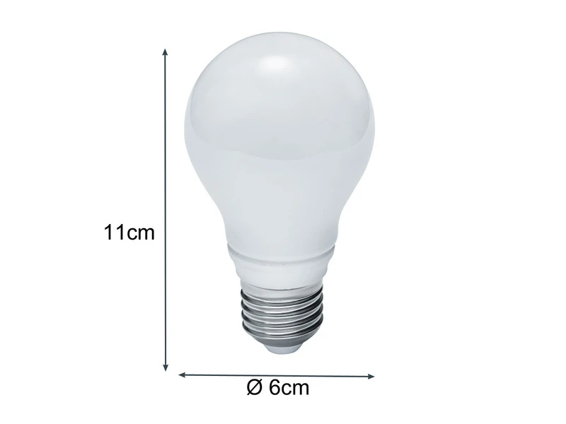 Das Leuchtmittel hat einen Durchmesser von 6cm, eine Höhe von 11cm, ist nicht dimmbar, und passend für alle Leuchten mit einer E27 Fassung.