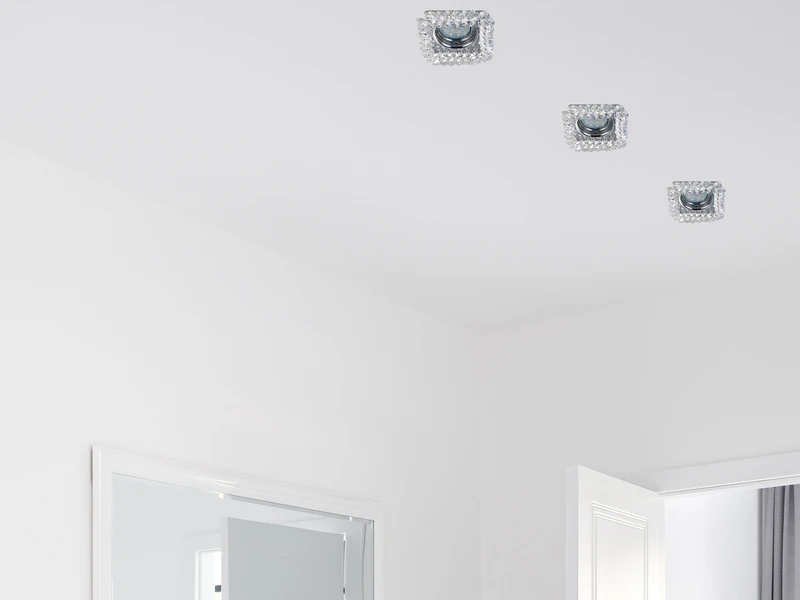 Der Einbauspot aus Metall und Glas hat eine Größe von 10 x 10 cm und erfordert einen Deckenausschnitt von 6 cm sowie eine Einbautiefe von min. 10 cm.