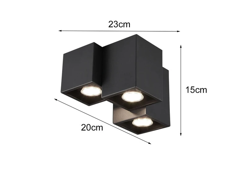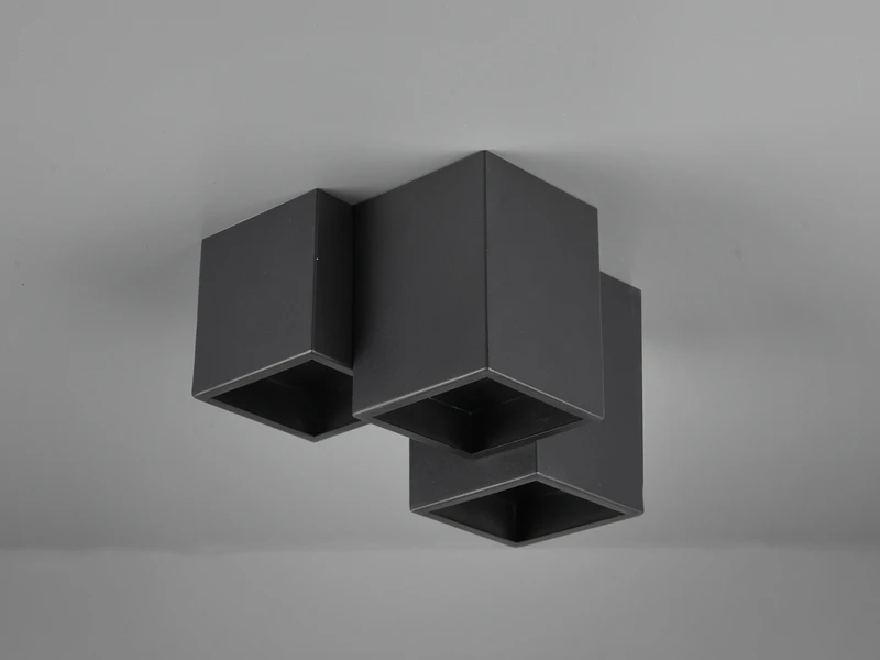 Die Zusammensetzung aus drei unterschiedlich langen Rechtecken ergibt eine moderne Leuchte für den Wohnraum oder Eingangsbereich. Im schlichten Schwarz matt lässt sich der Aufbaustrahler mit vorhandenen Farbkonzepten und modernen Einrichtungsstilen perfekt kombinieren.