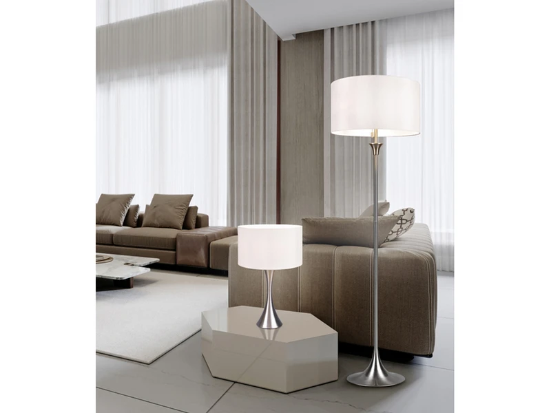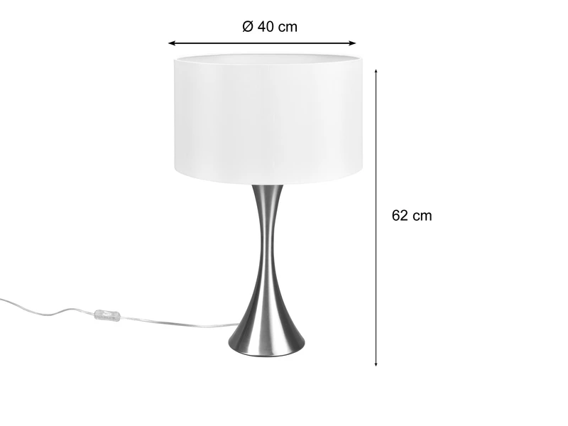 Der edle Stoffschirm der Tischleuchte in Kombination mit dem elegant geschwungenen Leuchtenfuß aus Metall vermitteln ein harmonisches Gesamtbild. Das schlichte und edle Design in Silber matt mit weißem Schirm setzt dekorative Akzente in Ihrem Zuhause. Mit einer Höhe von 62 cm sowie einem Schirm-Durchmesser von 40 cm passt sich die Lampe ihrer Umgebung dezent an und sorgt für ein gemütliches Licht.