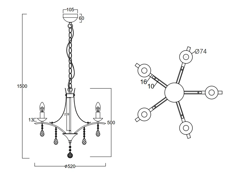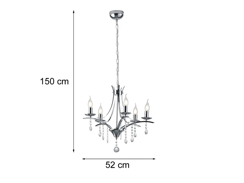 Der Lüster hat einen Durchmesser von 52cm und eine Abhängung von 150cm. Die fünf E14 Fassungen können mit Leuchtmitteln mit einer Leistung von max. je 40 Watt bestückt werden (nicht enthalten). Bei Verwendung dimmbarer Leuchtmittel können Sie die Leuchte über Ihre Hausinstallation dimmen und so zusätzlich für eine ganz individuelle Beleuchtung sorgen.