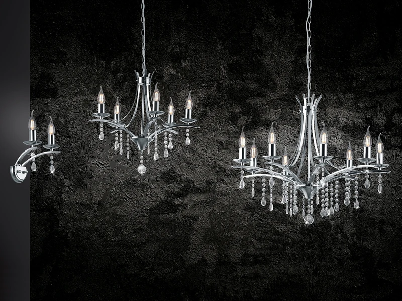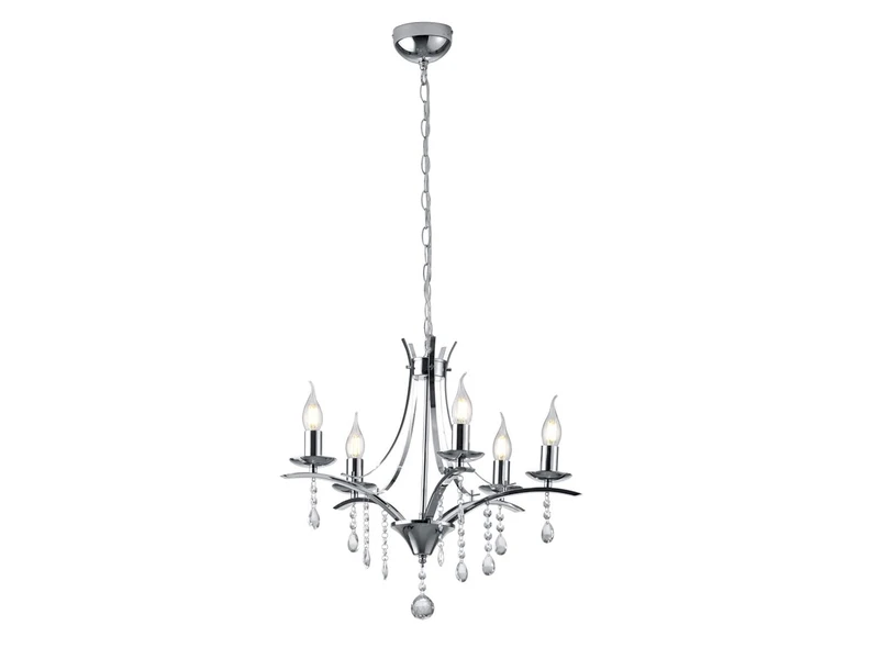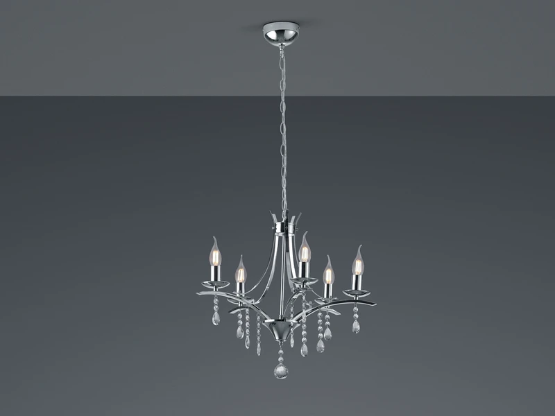 Die mehrflammige Pendelleuchte besticht durch ihre klaren Formen, sowie der chromfarbigen Metalloberfläche und dem klaren Kristallbehang aus Acryl. Einmal richtig in Szene gesetzt, wird die Hängeleuchte zu einem Gestaltungselement, das Ihr Raumdesign optimal ergänzt. Durch das Zusammenspiel der glänzenden und funkelnden Materialien entsteht ein schöner Lichteffekt, der Ihren Wohnbereich in ein stimmungsvolles Ambiente hüllt.
