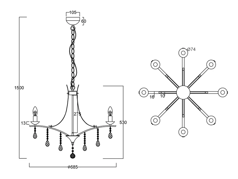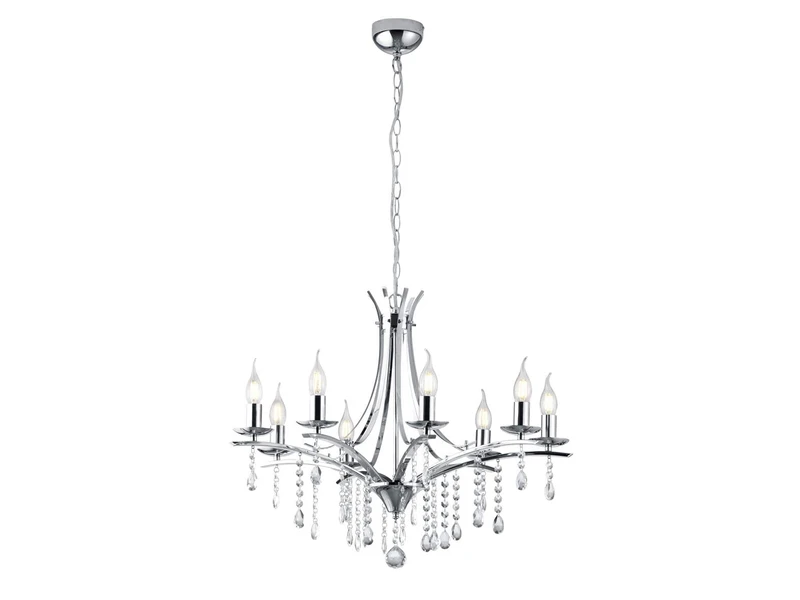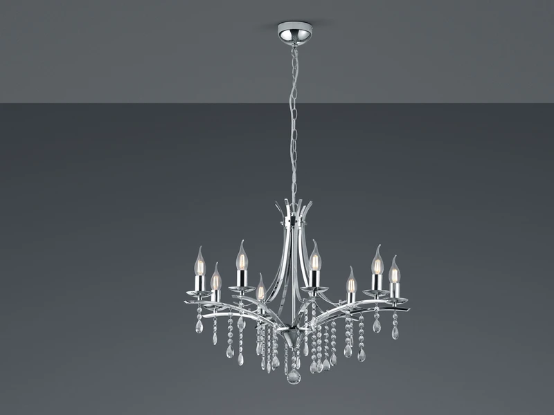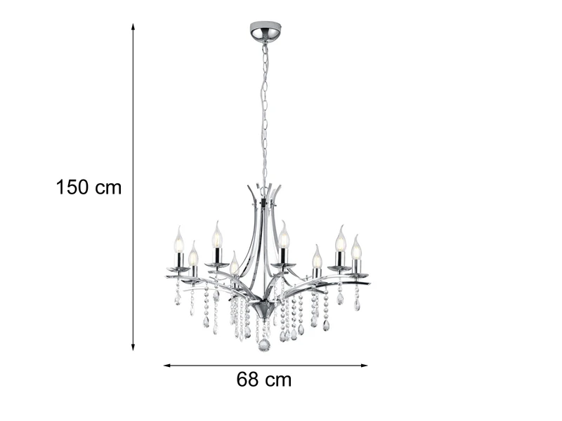 Der Lüster hat einen Durchmesser von 68cm und eine Abhängung von 150cm. Die acht E14 Fassungen können mit Leuchtmitteln mit einer Leistung von max. je 40 Watt bestückt werden (nicht enthalten). Bei Verwendung dimmbarer Leuchtmittel können Sie die Leuchte über Ihre Hausinstallation dimmen und so zusätzlich für eine ganz individuelle Beleuchtung sorgen.