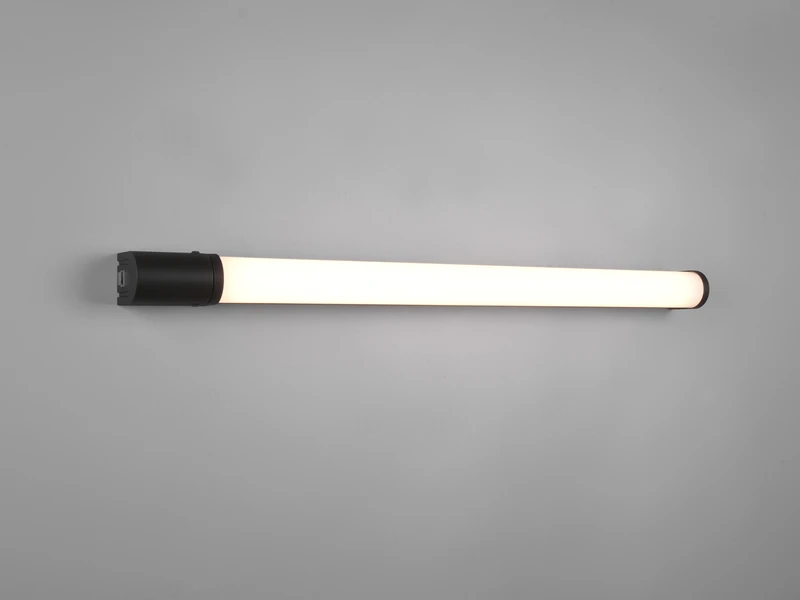 Durch das zeitlose Design und das dezente Farbkonzept in Schwarz matt harmoniert die Leuchte mit nahezu allen Einrichtungsstilen und fügt sich mit einer Breite von 79 cm und einer Ausladung von 7 cm gekonnt ins Wohnambiente ein.