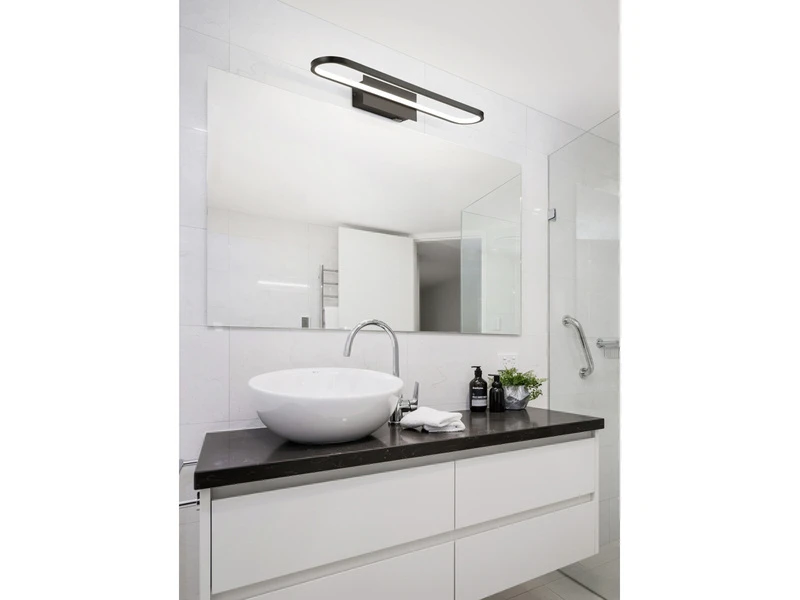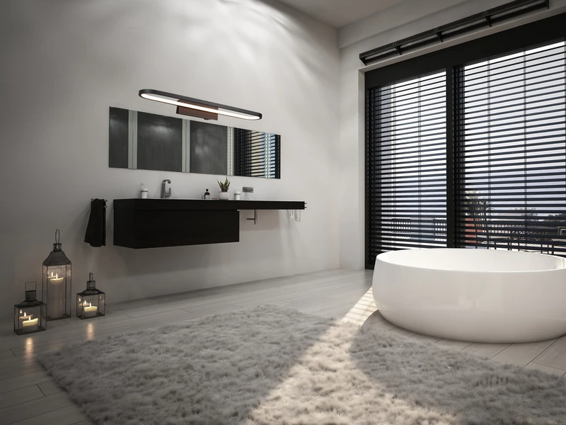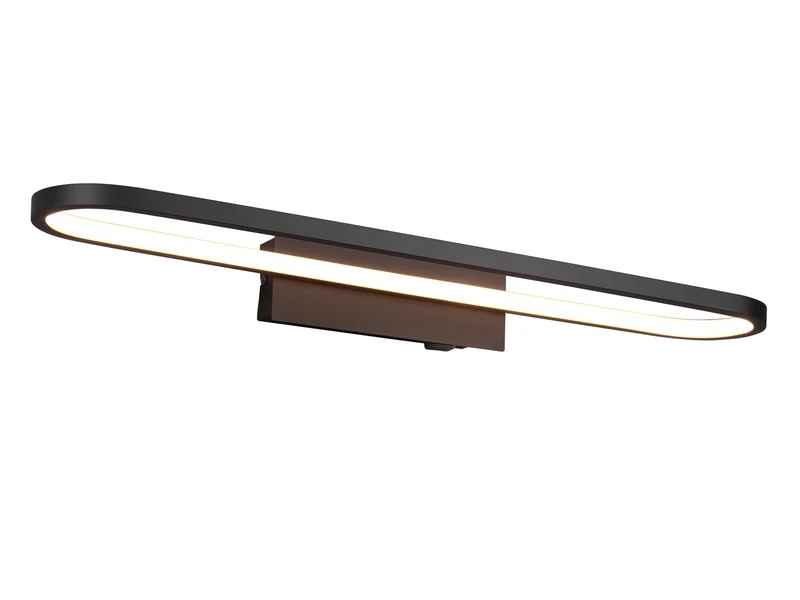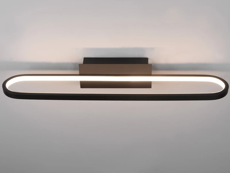 Der Schwarz matte Metallkorpus verleiht der Badezimmer Lampe eine exklusive Optik. Mit einer Breite von 60 cm und einer Ausladung von 8 cm ist sie für alle Arten von Bädern gut geeignet und überzeugt durch ihr effektives, aber dennoch blendfreies Licht.