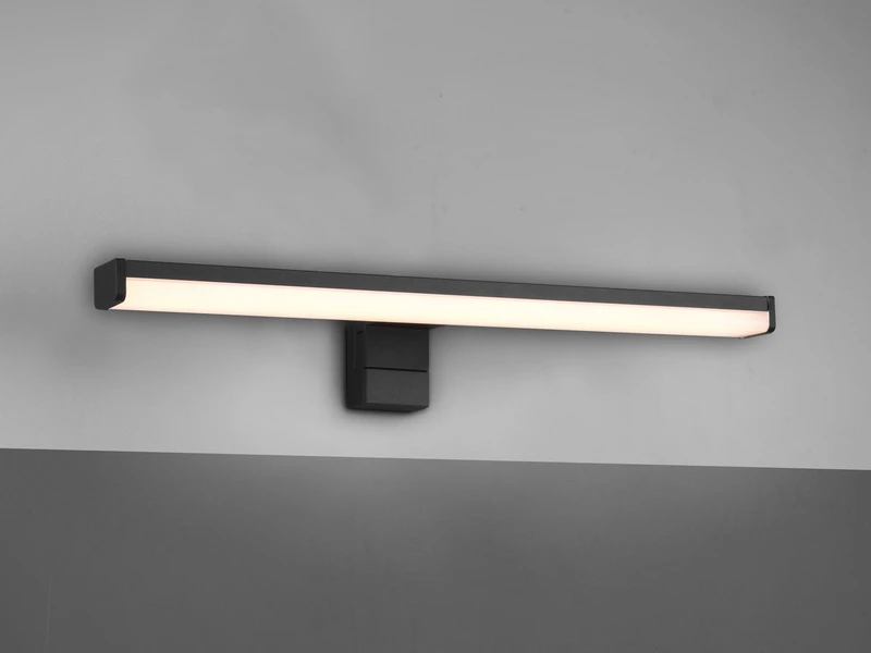Der Schwarz matte Korpus verleiht der Badezimmer Lampe eine zeitlose Optik. Mit einer Breite von 40 cm und einer Ausladung von 10,5 cm ist sie auch für kleinere Bäder gut geeignet und überzeugt durch ihr effektives, aber dennoch blendfreies Licht.