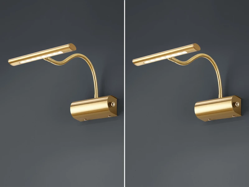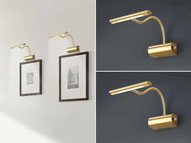 Der Leuchtenkopf ist durch ein Flexrohr flexibel einstellbar und mit einem SMD-LED Modul mit einer Leistung von 4 Watt und 380 Lumen in warmweiß ausgestattet, was eine effektive Bild-Beleuchtung garantiert. Darüber hinaus lässt sich die Leuchte über den seitlich integrierten Drehdimmer individuell dimmen.